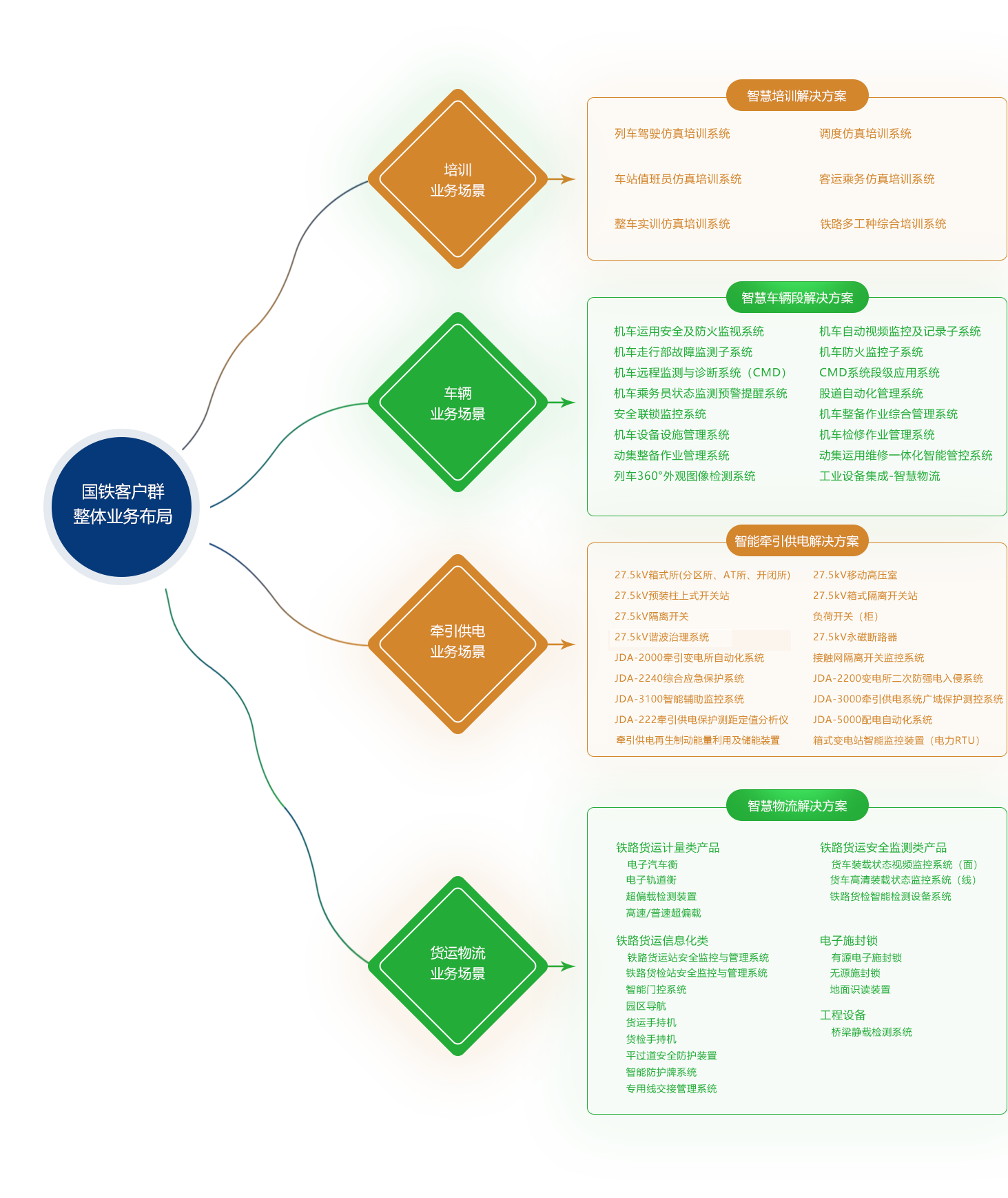 The core products of intelligent operation and maintenance solutions mainly include: locomotive operation safety and fire monitoring system, locomotive automatic video monitoring and recording subsystem, locomotive travel section fault detection subsystem, locomotive fire monitoring subsystem, locomotive remote detection and diagnosis system (cmd), cmd system section-level application system, locomotive crew status detection and early warning reminder system, harmonious locomotive fireless state return power supply device, stock automation management system, safety interlocking monitoring system, locomotive preparation operation integrated management system, locomotive service equipment and facilities management system, locomotive maintenance operation management system, dynamic set preparation operation management system, dynamic set operation and maintenance integrated intelligent control system, train 360° appearance image inspection system, intelligent logistics, etc.
