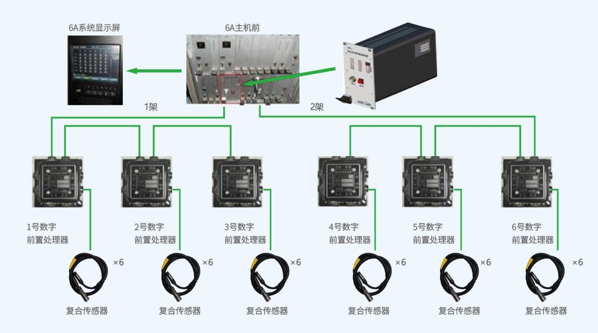 走行部故障監(jiān)測(cè)系統(tǒng)(型號(hào)YZD-2)是為保證車(chē)輛運(yùn)行安全與品質(zhì)、評(píng)估部件健康狀態(tài)而研制的在線實(shí)時(shí)監(jiān)測(cè)裝置。相比軸溫監(jiān)測(cè)系統(tǒng),該系統(tǒng)采用溫度、振動(dòng)和沖擊監(jiān)測(cè)相結(jié)合的多參數(shù)診斷機(jī)制及專(zhuān)家系統(tǒng),可在故障早期發(fā)現(xiàn)部件異常,提高運(yùn)營(yíng)安全性、及時(shí)檢修改善部件運(yùn)行環(huán)境、延長(zhǎng)部件使用壽命、減少運(yùn)營(yíng)成本。系統(tǒng)主要由車(chē)載主機(jī)、前置處理器及復(fù)合傳感器組成,整車(chē)結(jié)構(gòu)拓?fù)淙缦聢D示意。