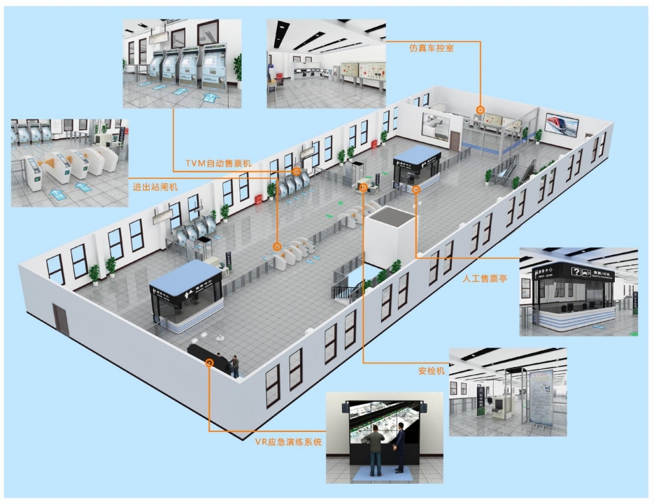 系統(tǒng)根據(jù)城軌車站實際功能與業(yè)務(wù)拓撲結(jié)構(gòu)構(gòu)建了基于車站ATS、C-LOW、CCTV和ISCS等應(yīng)用軟件與IBP盤、AFC、FAS、PA、PSD、軌旁信號等實訓(xùn)設(shè)備為基礎(chǔ)的場景與數(shù)學(xué)模型,是結(jié)合城軌實際運營場景和相關(guān)設(shè)備真實邏輯控制關(guān)系組建的集行車組織、供電控制、信號控制等于一體的仿真培訓(xùn)系統(tǒng)。系統(tǒng)可實現(xiàn)與車站級ATS、ISCS、CCTV等仿真實訓(xùn)系統(tǒng)的聯(lián)動聯(lián)控。系統(tǒng)采用分布式協(xié)同仿真及虛擬現(xiàn)實仿真技術(shù),實現(xiàn)了標準化作業(yè)培訓(xùn)與考核、應(yīng)急預(yù)案場景演練與比選、事故原因分析等功能。演練科目包括相鄰車站接發(fā)列車作業(yè)、車站值班員與站臺站廳站務(wù)員協(xié)同工作、車站值班員與維保人員協(xié)作演練以及大客流、惡天氣、車站火災(zāi)、設(shè)備故障、列車區(qū)間停車等。